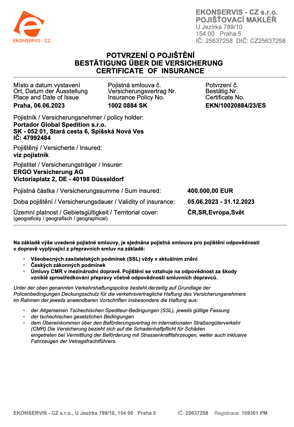Doklad o poistení zodpovednosti dopravcu (CMR poistenie)